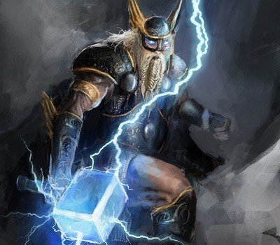 Le dieu Thor est un dieu guerrier par excellence. Associé au tonnerre, il se bat contre les géants avec son marteau Mjöllnir. Quand il n’est pas occupé à faire la guerre, il est également vu comme le dieu de la fertilité.